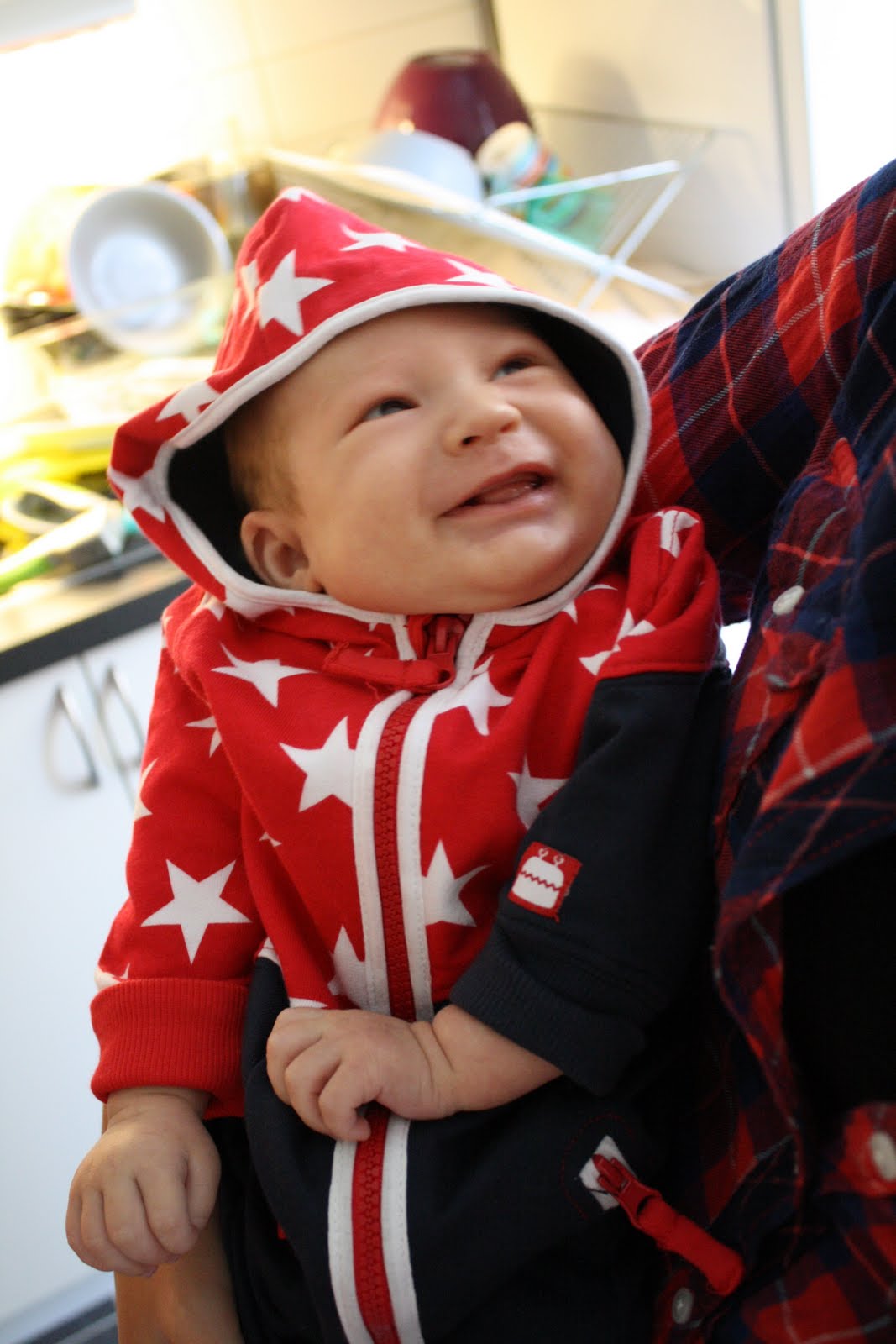 Vår lycklige lille stjärnaEtt barns leende.. som mamma smälter man både inuti och utanpå när ens lille pojke drar på smilebanden och ler med hela ansiktet. Ca halv fem på morgonen när grabben skall ha mat och jag är som allra tröttast så kollar han upp mot mig med sina stora mörka tindrande ögon och ler med hela ansiktet. Det är en underbar känsla och givetvis så smittar det av sig och man sitter där själv med världens bredaste smile :) Milo är en glad liten plutt. I fredagspresent av gudmor Tessie fick han en färgsprakande onepiece. Såhär glad blev han: